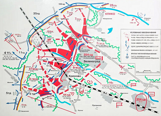 Крюково, однако, удержать не удалось — но это был последний успех врага. Немцы окончательно выдохлись, потеряв не менее половины личного состава и много техники. Рокоссовскому пришлось срочно эвакуировать свой штаб из Крюкова сначала в Льялово, затем в Сходню. Войска 16-й армии отошли, закрепились на рубеже: верховье реки Клязьмы — деревня Матушкино — восточная окраина Крюково — Дедовск.