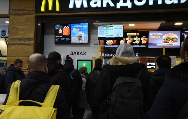 Желающих в последний раз поесть в «Макдоналдсе» оказалось столько, что очередь собиралась уже у входа. С понедельника, 14-го марта, рестораны «Макдоналдс» должны были приостановить работу в России.