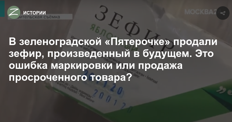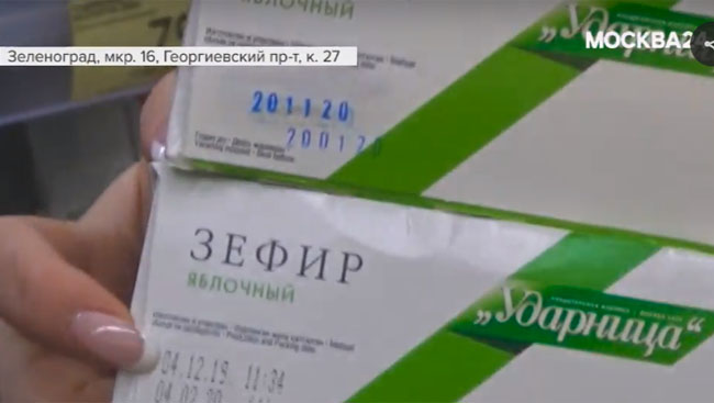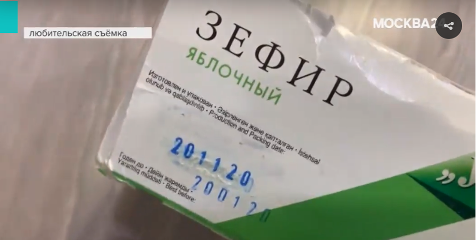 Телевизионщики нагрянули в «Пятерочку» в корпусе 1627, потому что там продавали зефир, изготовленный в будущем — 20 ноября 2020 года. Подделка ли это срока годности продукта или чья-то ошибка, управляющая сетью компания сказать не может — не нашла «концов». Сотрудники магазина неофициально говорят, что никто не будет подделывать сроки годности, а просроченный товар просто спишут.