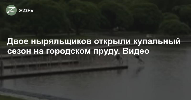 Местные жители открыли купальный сезон в недождливый пасмурный день между «тропическими» ливнями. Двое мужчин, прыгающих с мостика в городской пруд с разбегу, попали на видео.