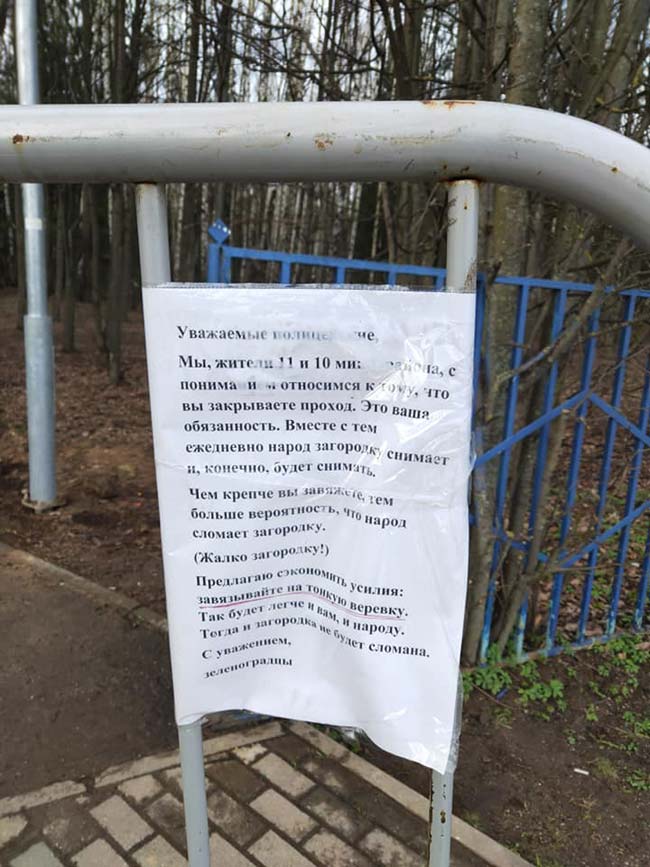 «Уважаемые полицейские, мы, жители 11 и 10 микрорайонов с пониманием относимся к тому, что вы закрываете проход. Это ваша обязанность. Вместе с тем, ежедневно народ загородку снимает и, конечно, будет снимать, — говорится в записке, прикрепленной к ограждению. — Чем крепче вы завяжете, тем больше вероятность, что народ сломает загородку (жалко загородку!). Предлагаю сэкономить усилия: завязывайте на тонкую веревку. Так будет легче и вам, и народу».