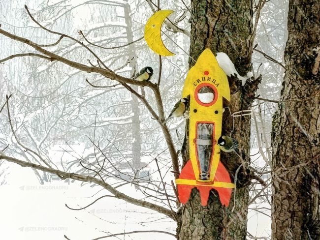 Местный житель Андрей сделал её в виде ракеты «Синица». В корпусе — семечки, а в иллюминаторе — сало: синицам эта конструкция явно нравится.