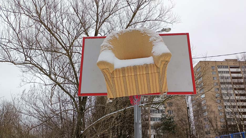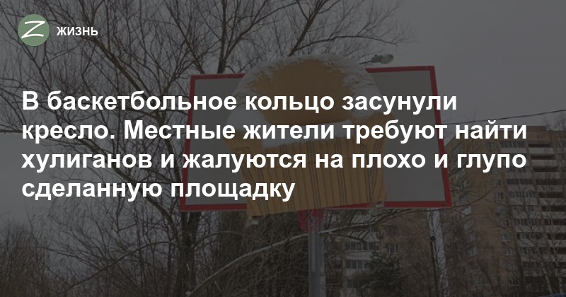 Во вторник утром в кольце для стритбола во дворе корпусов 518-521 оказалось кресло. «Это уже третье сломанное кольцо, — возмущаются в чате 5-го микрорайона. — Не хочет там никто видеокамеру поставить, чтобы …удаков этих вычислить? Вопрос не риторический». Есть ли во дворе камеры, неизвестно. «Зеленоград.ру» отправит запрос в префектуру.
